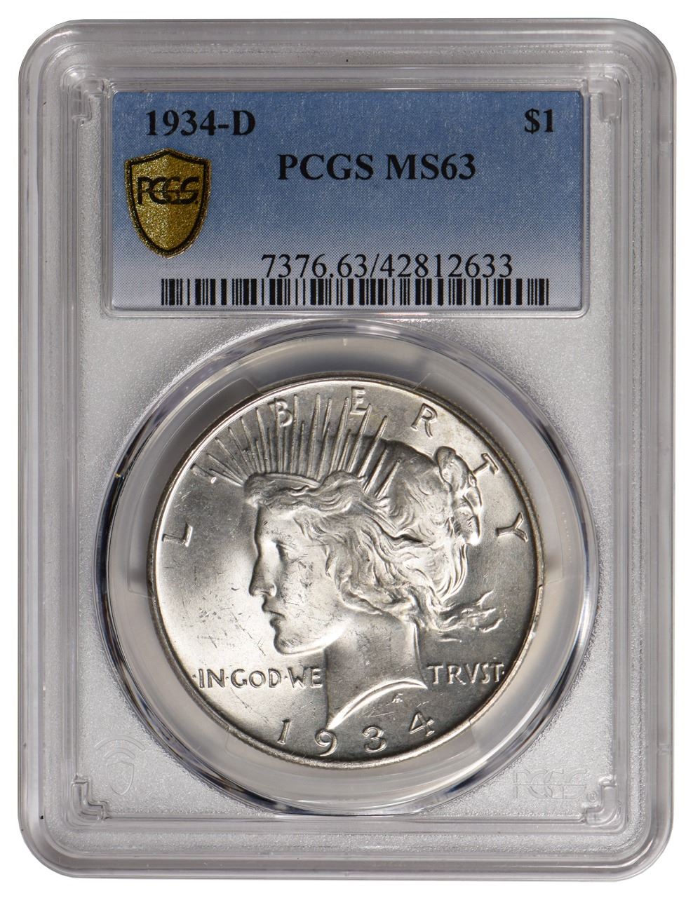 One 1934-D $1 Peace Silver Dollar PCGS MS63.