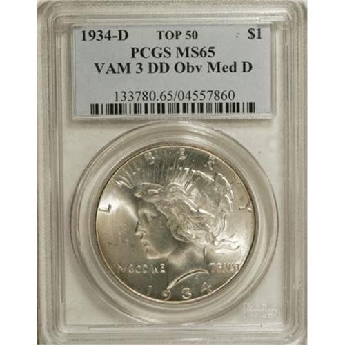 <B>1934-D $1 MS65 PCGS.</B></I> VAM-3. A Top 50 Variety. A frosty Gem example of this strong obverse doubled die, most visible at GOD WE and distinguished from its VAM-4 counterpart by the filled Medium D mintmark on the reverse. Well-defined and essentially untoned with strong doubling visible on the motto and profile. A reed mark on the bridge of Liberty's nose is the only flaw of note. Population: 4 in 65, 2 finer (4/07).<BR><BR><b>Shipping:</b> Coins & Currency (<a target="_blank" href="http://www.heritageauctions.com/common/shipping.php">view shipping information</a>)