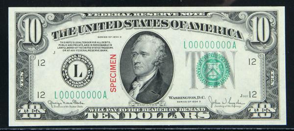 1934-D, $10 Federal Reserve Note. SPECIMEN