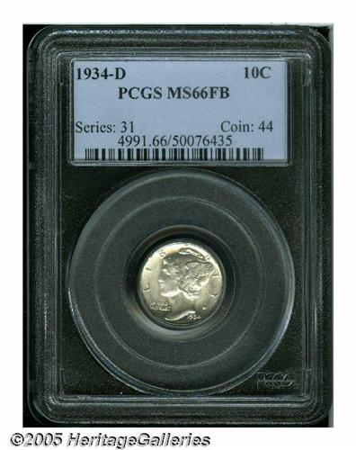 <B>1934-D<10C> MS66 Full Bands PCGS.</B></I> Lustrous surfaces display just a hint of light tan color on the reverse, and the design features are sharply struck. A few very miniscule marks on Mercury's cheek are mentioned for accuracy. Population: 98 in 66, 23 finer (4/05).