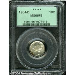<B>1934-D<10C> MS66 Full Bands PCGS.</B></I> A few splashes of burnt-orange toning occur around some of the borders of this sharply struck, lustrous Mercury dime. This piece is devoid of any major impairments. Population: 99 in 66, 20 finer (9/04). <BR><BR><B>Important notice:</B> Heritage usually auctions material at the rate of 200-250 lots per hour. On some occasions eBay Live bid software or the Internet may not be able to keep up with the pace of the auction. We recommend placing a realistic absentee bid now as insurance to avoid disappointment. Occasionally the auctioneer may eliminate or reject an eBay Live bid, and the auctioneer may also reopen a lot after the close of the eBay live bidding (usually because we missed an audience bid), and may reject your bid even if it shows you as the winning bidder. By bidding via eBay Live, you agree that Heritage may award the lot to another bidder at its sole discretion under the circumstances described above or any other reasonable circumstances. Since eBay bids are not shown to us until we open the lot on the floor, we treat those bids just like floor bids. In most cases the floor responds before the eBay bid is presented to us, due to Internet lag time, so for consistency we have made it a policy that floor bids are always considered first over tie eBay live bids. Also please note that all Heritage lots purchased through eBay Live carry a 20% Buyer's Premium. Please make sure you read the Terms and Conditions before you bid.