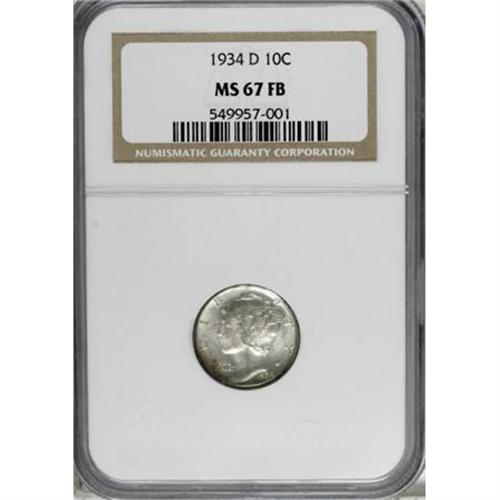 <B>1934-D 10C MS67 Full Bands NGC.</B></I> This satiny and boldly impressed piece has essentially untoned centers with splashes of rose at the left obverse and reverse margins. Wonderful preservation and top-notch eye appeal. Census: 8 in 67 Full Bands, 1 finer (12/07).<BR><BR><B>Coin Engraver:</B> Adolph A. Weinman<BR><BR><b>Shipping:</b> Coins & Currency (<a target="_blank" href="http://www.heritageauctions.com/common/shipping.php">view shipping information</a>)