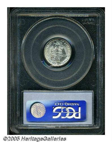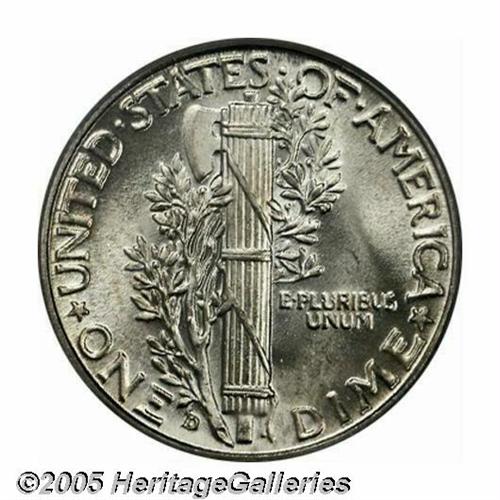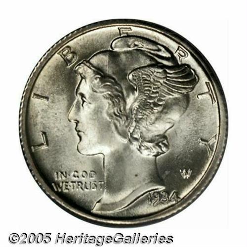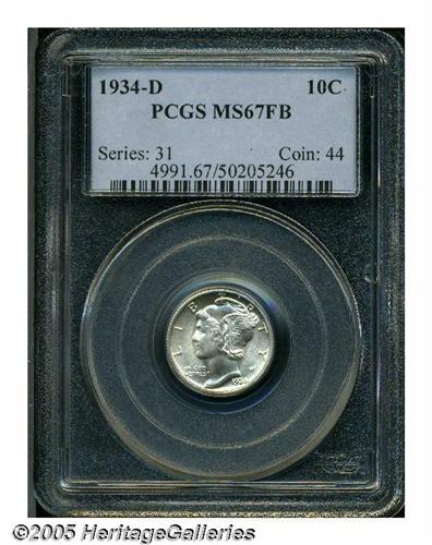 <B>1934-D<10C> MS67 Full Bands PCGS.</B></I> Essentially untoned with thick, satiny luster and almost flawlessly preserved surfaces. One of the more challenging later-date Mercury Dime issues in Superb, Full Bands condition. Population: 23 in 67, 0 finer (4/05).