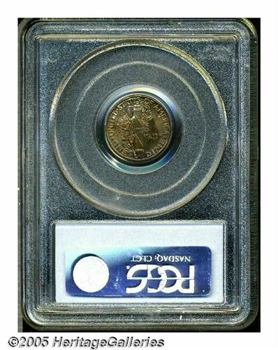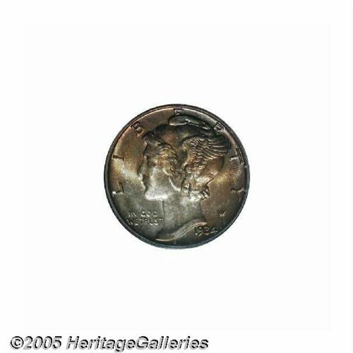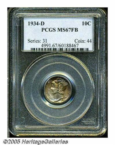 <B>1934-D<10C> MS67 Full Bands PCGS.</B></I> Lushly patinated in blended apple-green, plum, and peach colors, this lustrous and nearly immaculate Superb Gem is a treat for the eyes. The strike is pinpoint-sharp in the centers, and only the upper tip of the LI in LIBERTY has not received a full blow from the dies. Struck near the depth of the Great Depression, it is little wonder that few pieces have survived in such exemplary condition. Population: 25 in 67, 0 finer (6/05).