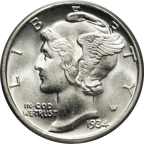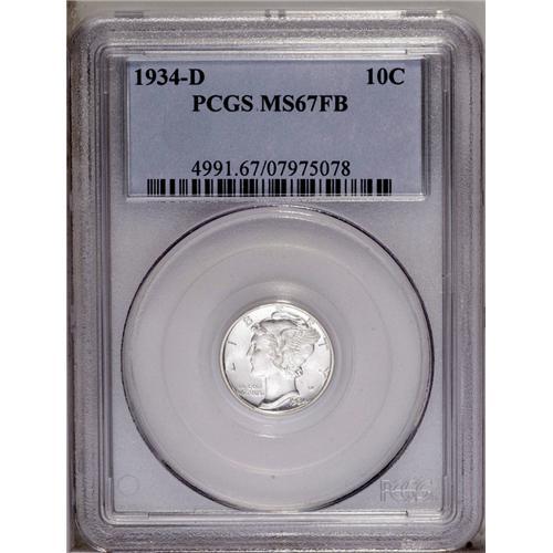 <B>1934-D<10C> MS67 Full Bands PCGS.</B></I> Snowy-white with scintillating luster, nearly flawless surfaces, and an uncommonly strong strike. One of the most conditionally challenging issues in the short set (generally considered to be from 1934 to 1945) of Mercury dimes. Population: 28 in 67, 0 finer (3/06).