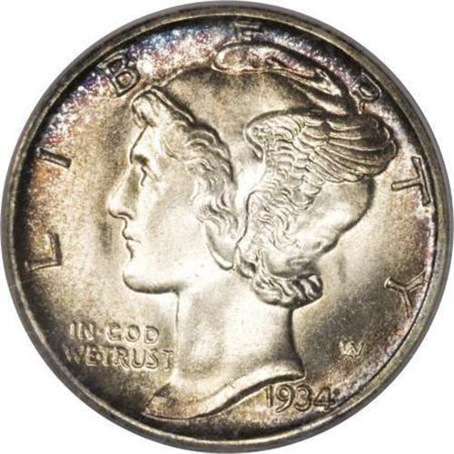 <B>1934-D 10C MS67 Full Bands PCGS.</B></I> Ex: Dan Miller.<B> </B></I>A magnificent Superb Gem survivor from this early Mercury short-set issue, solidly struck with vibrant luster and elegant peach and sapphire shadings at the margins. The minimally toned centers offer a delightful gleam. Tied for the finest Full Bands example certified by PCGS (12/07).<BR><I>From The Scheppman Collection, #4 PCGS Registry of Full Band Mercury Dimes.</B></I><BR><BR><B>Coin Engraver:</B> Adolph A. Weinman<BR><BR><b>Shipping:</b> Coins & Currency (<a target="_blank" href="http://www.heritageauctions.com/common/shipping.php">view shipping information</a>)