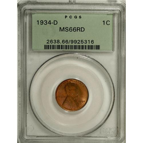 <B>1934-D 1C MS66 Red PCGS.</B></I> PCGS Population (356/21). NGC Census: (220/22). Mintage: 28,446,000. Numismedia Wsl. Price for NGC/PCGS coin in MS66: $200. (#2638)<BR><BR><b>Shipping:</b> Coins & Currency (<a target="_blank" href="http://www.heritageauctions.com/common/shipping.php">view shipping information</a>)