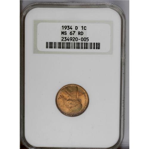 <B>1934-D<1C> MS67 Red NGC.</B></I> A lovely Superb Gem that has rich mint red color with a bit of light olive patina intermixed. An appealing piece housed in an early holder. Census: 22 in 67 Red, 0 finer (8/06).