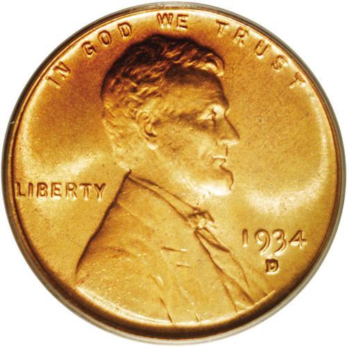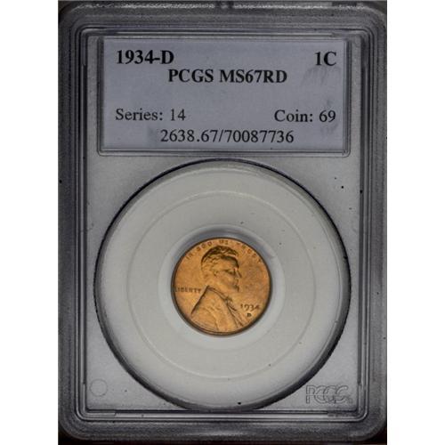 <B>1934-D<1C> MS67 Red PCGS.</B></I> A stunning Superb Gem of this date and mint, with strong luster in the fields and attractive Red color throughout. There is a minute speck behind Abe's eye and the reverse die shows minor peripheral wear. The mintmark is quite thick and ponderous when compared with the digits in the date. In grading terms, this one is tied with a select group of other Alpha Males. Population: 19 in 67, 0 finer (3/06).<BR><I>From The Kendall Marie #4 All-Time Finest PCGS Registry of Lincoln Cents with Varieties, Circulation Strikes, 1909-1958.</B></I> <BR><BR><B>Important notice:</B> Heritage usually auctions material at the rate of 200-250 lots per hour. On some occasions eBay Live bid software or the Internet may not be able to keep up with the pace of the auction. We recommend placing a realistic absentee bid now as insurance to avoid disappointment. Occasionally the auctioneer may eliminate or reject an eBay Live bid, and the auctioneer may also reopen a lot after the close of the eBay live bidding (usually because we missed an audience bid), and may reject your bid even if it shows you as the winning bidder. By bidding via eBay Live, you agree that Heritage may award the lot to another bidder at its sole discretion under the circumstances described above or any other reasonable circumstances. Since eBay bids are not shown to us until we open the lot on the floor, we treat those bids just like floor bids. In most cases the floor responds before the eBay bid is presented to us, due to Internet lag time, so for consistency we have made it a policy that floor bids are always considered first over tie eBay live bids. Also please note that all Heritage lots purchased through eBay Live carry a 20% Buyer's Premium. Please make sure you read the Terms and Conditions before you bid. This lot is being auctioned in conjunction with a live floor auction by Heritage Galleries & Auctioneers. All final auction and invoice information will be supplied by Heritage Galleries & Auctioneers, and all other information should be considered preliminary. Lot:538 <BR><BR><B>Winning Notification and Billing:</B> After the FINAL session in this auction is complete, Heritage will send e-mail and snail mail invoices. This process normally takes several days. All final auction and invoice information will be supplied by Heritage Galleries & Auctioneers, and all other information should be considered preliminary. <BR><BR>This auction will be conducted on a live auction floor and over the Internet through eBay Live. If you choose to place an absentee bid, please take a moment to <font color='#0000ff'><u><a href='http://pages.ebay.com/liveauctions/help/before/laabsentee.html'>learn how eBay Live absentee bidding works</a></u></font><font color='#000000'>