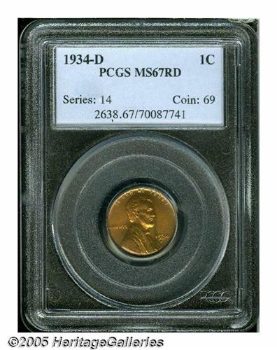 <B>1934-D<1C> MS67 Red PCGS.</B></I> Bright and flashy throughout with lilac tinted peripheries. The only noticeable flaw is a small carbon spot inside the O in ONE. Population: 19 in 67, 0 finer (6/05).<BR><I>From The William Bickel Collection, Part One.</B></I>
