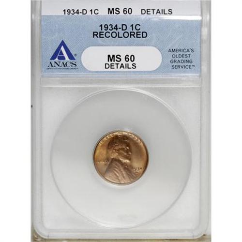 <B>1934-D 1C --Recolored--ANACS. MS60 Details.</B></I> NGC Census: (0/624). PCGS Population (1/1567). Mintage: 28,446,000. (#2638)<BR><BR><B>Coin Engraver:</B> Victor D. Brenner<BR><BR><b>Shipping:</b> Coins & Currency (<a target="_blank" href="http://www.heritageauctions.com/common/shipping.php">view shipping information</a>)