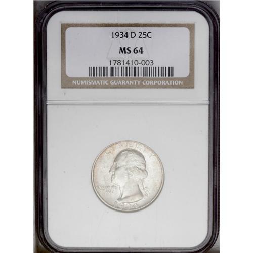 1934-D 25C Heavy Motto MS64 NGC. Luster dominates the 1934-D[25C] Heavy Motto MS64 NGC.
