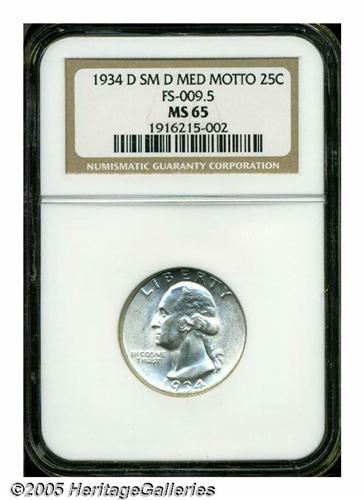 <B>1934-D<25C> Heavy Motto MS65 NGC.</B></I> FS-009.5. Small D. NGC mislabeled this coin as a "Medium Motto," when in fact it is the Heavy Motto variety. Lustrous surfaces are essentially brilliant, and the devices are sharply struck. A few minute marks on Washington's face and eagle are mentioned for accuracy.