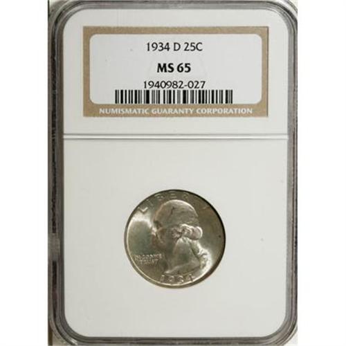 <B>1934-D 25C Heavy Motto MS65 NGC.</B></I> Lightly toned in honey, ice-blue, and autumn-brown. A beautiful and lustrous Gem of this popular low mintage issue. The mintmark is filled, but the strike is good and only unimportant marks are present.<BR><BR><b>Shipping:</b> Coins & Currency (<a target="_blank" href="http://www.heritageauctions.com/common/shipping.php">view shipping information</a>)