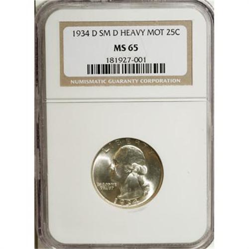 <B>1934-D 25C Heavy Motto MS65 NGC.</B></I> Small D. This is the sole example of the Small D, Heavy Motto variety that is certified as such by NGC (on the holder). It is also a frosty, highly lustrous, brilliant Gem example of this Washington quarter semi-key date issue. Boldly struck and well preserved, there are no objectionable marks on either side. <BR><BR><b>Shipping:</b> Coins & Currency (<a target="_blank" href="http://www.heritageauctions.com/common/shipping.php">view shipping information</a>)
