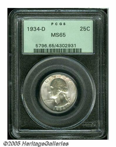 <B>1934-D<25C> Heavy Motto MS65 PCGS.</B></I> Well struck and fully lustrous, with faint rose and a few specks of charcoal toning near the border areas. The carefully preserved surfaces only reveal a few small milling marks on each side.