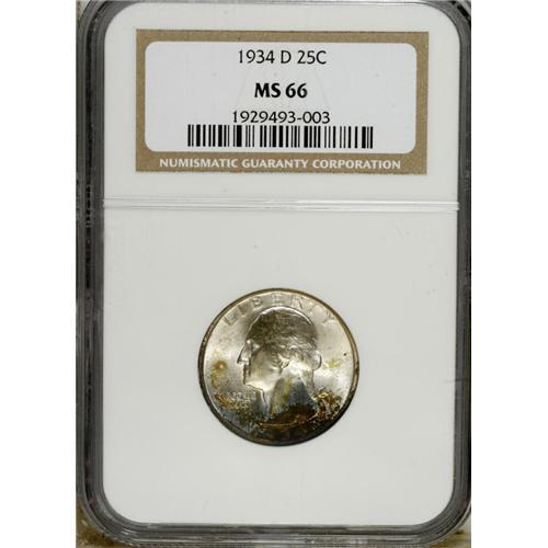 <B>1934-D 25C Heavy Motto MS66 NGC.</B></I> Mottled, deep russet and forest-green intermingle on parts of this lustrous and robustly struck Gem. The remainder of the coin is brilliant. A pleasing example of this elusive early Denver Mint issue.<BR><BR><b>Shipping:</b> Coins & Currency (<a target="_blank" href="http://www.heritageauctions.com/common/shipping.php">view shipping information</a>)