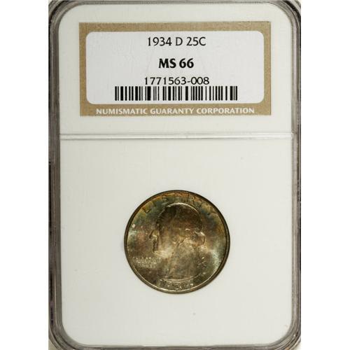 <B>1934-D 25C Heavy Motto MS66 NGC.</B></I> Violet-blue hues radiate all around this gem that has a few marks visible. The '34-D is anything but common in higher Mint State grades despite a respectable mintage of 3.5 million plus pieces. Census: 26 in 66, 4 finer (11/06).<BR><BR><b>Shipping:</b> Coin/Currency (<a target="_blank" href="http://www.heritageauctions.com/common/shipping.php">view shipping information</a>)