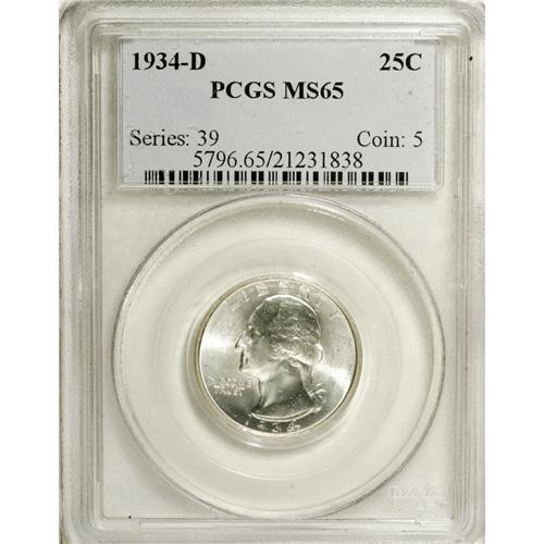 1934-D 25C MS65 PCGS. Rich silver-gray and yellow-gree