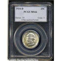 <B>1934-D<25C> MS66 PCGS.</B></I> Apple-green and gold colors frame the steel-gray portrait, while the reverse features pastel peach and gunmetal-gray patina. The obverse is undisturbed, and only a wispy mark on the eagle's head denies a finer grade. Early Denver Mint issues of this increasingly popular series are invariably scarce and under collector demand in lofty Mint State grades. Population: 46 in 66, 2 finer (3/04). <BR><BR><B>Important notice:</B> Heritage usually auctions material at the rate of 200-250 lots per hour. On some occasions eBay Live bid software or the Internet may not be able to keep up with the pace of the auction. We recommend placing a realistic absentee bid now as insurance to avoid disappointment. Occasionally the auctioneer may eliminate or reject an eBay Live bid, and the auctioneer may also reopen a lot after the close of the eBay live bidding (usually because we missed an audience bid), and may reject your bid even if it shows you as the winning bidder. By bidding via eBay Live, you agree that Heritage may award the lot to another bidder at its sole discretion under the circumstances described above or any other reasonable circumstances. Since eBay bids are not shown to us until we open the lot on the floor, we treat those bids just like floor bids. In most cases the floor responds before the eBay bid is presented to us, due to Internet lag time, so for consistency we have made it a policy that floor bids are always considered first over tie eBay live bids. Also please note that all Heritage lots purchased through eBay Live carry a 20% Buyer's Premium. Please make sure you read the Terms and Conditions before you bid. </span></font></tr></table></td></tr></table>
