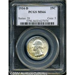 <B>1934-D<25C> MS66 PCGS.</B></I> The obverse is lightly toned with a splash of golden-olive patina on the lower part of that side. The reverse is mostly brilliant. Exceptionally clean and lustrous with no obvious surface impairments. Population: 59 in 66, 3 finer (7/04). <BR><BR><B>Important notice:</B> Heritage usually auctions material at the rate of 200-250 lots per hour. On some occasions eBay Live bid software or the Internet may not be able to keep up with the pace of the auction. We recommend placing a realistic absentee bid now as insurance to avoid disappointment. Occasionally the auctioneer may eliminate or reject an eBay Live bid, and the auctioneer may also reopen a lot after the close of the eBay live bidding (usually because we missed an audience bid), and may reject your bid even if it shows you as the winning bidder. By bidding via eBay Live, you agree that Heritage may award the lot to another bidder at its sole discretion under the circumstances described above or any other reasonable circumstances. Since eBay bids are not shown to us until we open the lot on the floor, we treat those bids just like floor bids. In most cases the floor responds before the eBay bid is presented to us, due to Internet lag time, so for consistency we have made it a policy that floor bids are always considered first over tie eBay live bids. Also please note that all Heritage lots purchased through eBay Live carry a 20% Buyer's Premium. Please make sure you read the Terms and Conditions before you bid. </span></font></tr></table></td></tr></table>