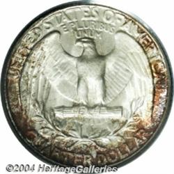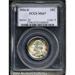 <B>1934-D<25C> MS67 PCGS.</B></I> Generally nicely struck, with blushes of gold-orange and lavender-lilac toning around portions of the peripheries. The obverse shows a somewhat diagonal streaky appearance across Washington's portrait and parts of the fields. The surfaces on this example are seemingly free of major abrasions. Population: 2 in 67, 0 finer (3/04). <BR><BR><B>Important notice:</B> Heritage usually auctions material at the rate of 200-250 lots per hour. On some occasions eBay Live bid software or the Internet may not be able to keep up with the pace of the auction. We recommend placing a realistic absentee bid now as insurance to avoid disappointment. Occasionally the auctioneer may eliminate or reject an eBay Live bid, and the auctioneer may also reopen a lot after the close of the eBay live bidding (usually because we missed an audience bid), and may reject your bid even if it shows you as the winning bidder. By bidding via eBay Live, you agree that Heritage may award the lot to another bidder at its sole discretion under the circumstances described above or any other reasonable circumstances. Since eBay bids are not shown to us until we open the lot on the floor, we treat those bids just like floor bids. In most cases the floor responds before the eBay bid is presented to us, due to Internet lag time, so for consistency we have made it a policy that floor bids are always considered first over tie eBay live bids. Also please note that all Heritage lots purchased through eBay Live carry a 20% Buyer's Premium. Please make sure you read the Terms and Conditions before you bid. </span></font></tr></table></td></tr></table>