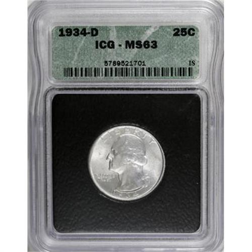 <B>1934-D 25C Medium Motto MS63 ICG.</B></I> NGC Census: (155/454). PCGS Population (252/744). Mintage: 3,527,200. Numismedia Wsl. Price for NGC/PCGS coin in MS63: $250. (#5796)<BR><BR><B>Coin Engraver:</B> John Flanagan<BR><BR><b>Shipping:</b> Coins & Currency (<a target="_blank" href="http://www.heritageauctions.com/common/shipping.php">view shipping information</a>)