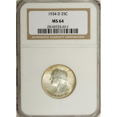 1934-D 25C Medium Motto MS64 NGC. NGC Census: (592