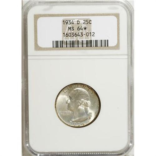 <B>1934-D 25C Medium Motto MS64</B></I> S<B> NGC.</B></I> NGC Census: (296/153). PCGS Population (441/296). Mintage: 3,527,200. Numismedia Wsl. Price for NGC/PCGS coin in MS64: $488. (#5796)<BR><BR><B>Coin Engraver:</B> John Flanagan<BR><BR><b>Shipping:</b> Coins & Currency (<a target="_blank" href="http://www.heritageauctions.com/common/shipping.php">view shipping information</a>)