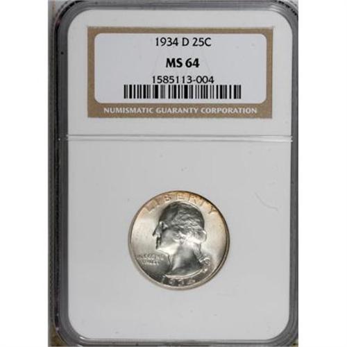 <B>1934-D 25C Medium Motto MS64 NGC.</B></I> NGC Census: (300/154). PCGS Population (443/299). Mintage: 3,527,200. Numismedia Wsl. Price for NGC/PCGS coin in MS64: $488. (#5796)<BR><BR><B>Coin Engraver:</B> John Flanagan<BR><BR><b>Shipping:</b> Coins & Currency (<a target="_blank" href="http://www.heritageauctions.com/common/shipping.php">view shipping information</a>)