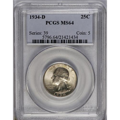<B>1934-D<25C> Medium Motto MS64 PCGS.</B></I> An attractive near-Gem example of this D-mint issue, one that is rather difficult to locate in high grades. A couple of small marks are noted on the obverse that limit the grade.