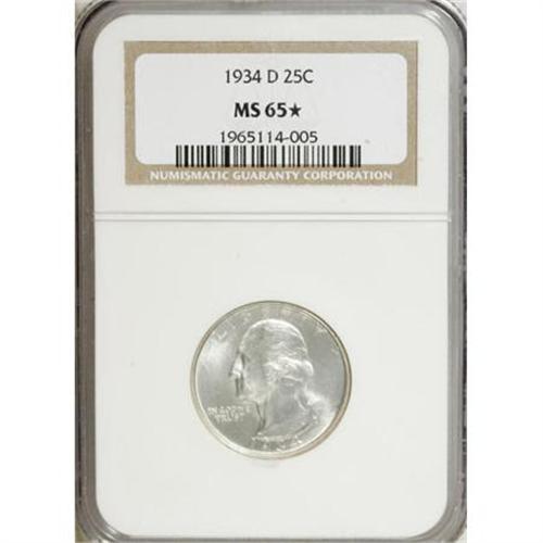 <B>1934-D 25C Medium Motto MS65</B></I><img src="/images/star.gif" width="10" height="10" alt="" border="0"><B> NGC.</B></I> . NGC Census: (124/33). PCGS Population (223/78). Mintage: 3,527,200. Numismedia Wsl. Price for NGC/PCGS coin in MS65: $1,100. (#5796)<BR><BR><B>Coin Engraver:</B> John Flanagan<BR><BR><b>Shipping:</b> Coins & Currency (<a target="_blank" href="http://www.heritageauctions.com/common/shipping.php">view shipping information</a>)