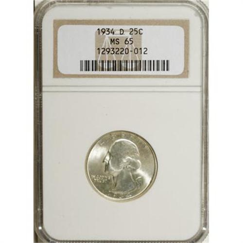 <B>1934-D 25C Medium Motto MS65 NGC.</B></I> NGC Census: (124/33). PCGS Population (223/78). Mintage: 3,527,200. Numismedia Wsl. Price for NGC/PCGS coin in MS65: $1,100. (#5796)<BR><BR><B>Coin Engraver:</B> John Flanagan<BR><BR><b>Shipping:</b> Coins & Currency (<a target="_blank" href="http://www.heritageauctions.com/common/shipping.php">view shipping information</a>)