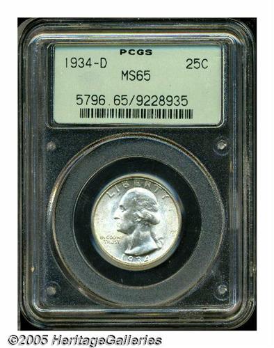 <B>1934-D<25C> Medium Motto MS65 PCGS.</B></I> A lustrous and nearly untoned Gem, devoid of detrimental marks. The major devices are well struck, while LIBERTY and the denomination exhibit a hint of softness of definition. Housed in a green label holder.