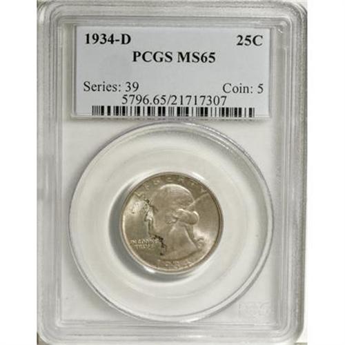 <B>1934-D 25C Medium Motto MS65 PCGS.</B></I> A well struck with shimmering Gem. Speckled purple-russet patina is splashed over the left side of the obverse, while the right obverse is visited by a semi-circular toning streak. The early Denver issues are scarce in Mint State.<BR><BR><B>Coin Engraver:</B> John Flanagan<BR><BR><b>Shipping:</b> Coins & Currency (<a target="_blank" href="http://www.heritageauctions.com/common/shipping.php">view shipping information</a>)