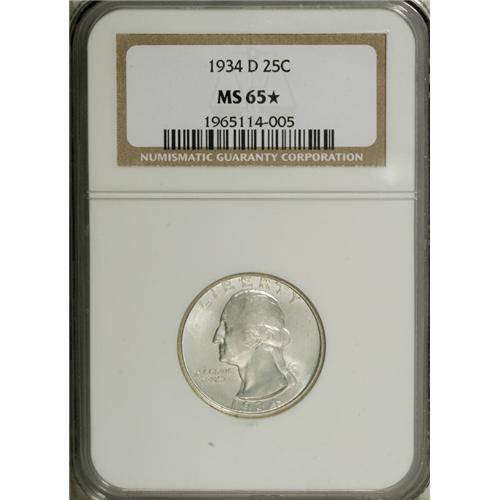 <B>1934-D 25C Medium Motto MS65 <img border='0' src='http://www.heritagecoins.com/images/star.gif' width=10 height=10> NGC.</B></I> The silver-white surfaces offer much prooflikeness and are essentially distraction-free. This well-struck piece shows only a tiny tick on the corner of Washington's chin, and the enormous eye appeal is justly deserving of NGC's Star designation. The highest graded at NGC (1/07).<BR><BR><b>Shipping:</b> Coins & Currency (<a target="_blank" href="http://www.heritageauctions.com/common/shipping.php">view shipping information</a>)