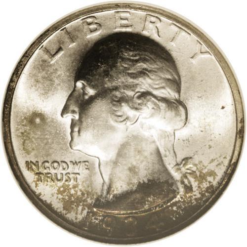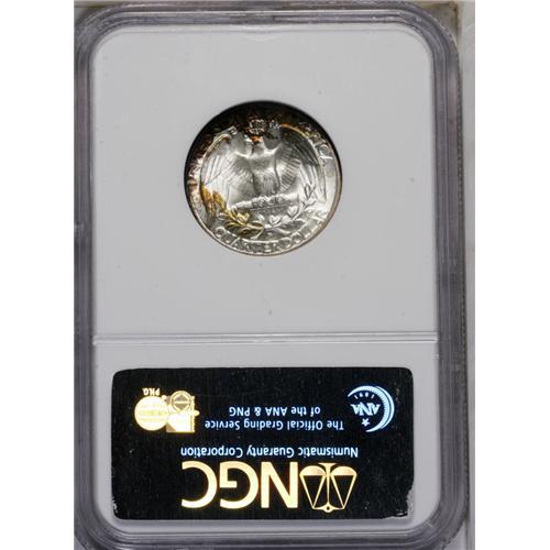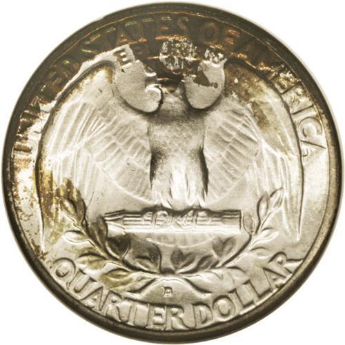 <B>1934-D<25C> Medium Motto MS66 NGC.</B></I> Mottled, deep reddish-russet and forest-green intermingle across this lustrous and nicely struck Gem. The remainder of the coin presents as brilliant. A pleasing example of this elusive early Denver Mint issue. Census: 28 in 66, 3 finer (5/06).