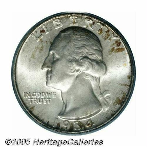 <B>1934-D<25C> Medium Motto MS66 PCGS.</B></I> An original and impeccably preserved '34-D Washington that boasts unbeatable luster and is lightly toned in mottled russet shades over the obverse, the reverse is brilliant. Some slight weakness of strike is detected at the border areas. Population: 57 in 66, 3 finer (3/05).