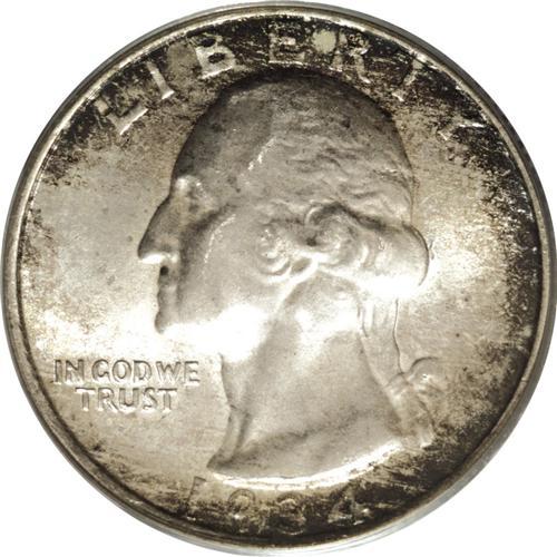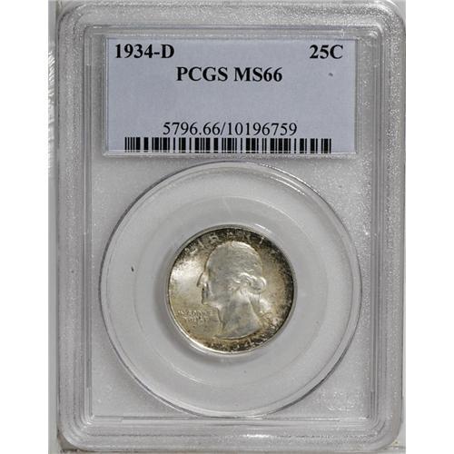 <B>1934-D<25C> Medium Motto MS66 PCGS.</B></I> Charcoal and hazy tan-golden colors frame the steel-gray obverse portrait, while the reverse features a more even steel-silver appearance. The obverse is undisturbed, and only a wispy mark on the eagle's right (facing) leg denies a finer grade. Early Denver Mint issues of this increasingly popular series are invariably scarce and under collector demand in lofty Mint State grades. Population: 76 in 66, 3 finer (7/06).