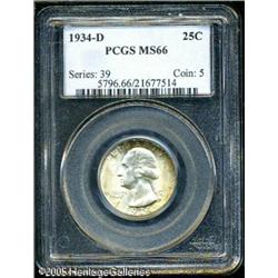 <B>1934-D 25C Medium Motto MS66 PCGS.</B></I> Frosty, lustrous surfaces with some golden-brown peripheral toning on the obverse, the reverse is essentially brilliant. A milling mark adjacent to Washington's eye is the only noteworthy distraction. An appealing Gem, and one of the semi-key issues of the series. Population: 55 in 66, 3 finer (1/05). Lot:6799