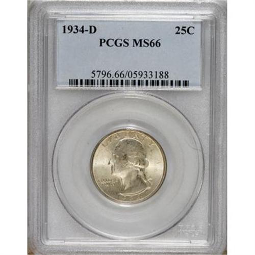 <B>1934-D 25C Medium Motto MS66 PCGS.</B></I> The obverse is pearl-gray with dashes of russet. Rich lemon-gold patina graces the reverse. Lustrous, exactingly struck, and well preserved.<BR><BR><b>Shipping:</b> Coins & Currency (<a target="_blank" href="http://www.heritageauctions.com/common/shipping.php">view shipping information</a>)
