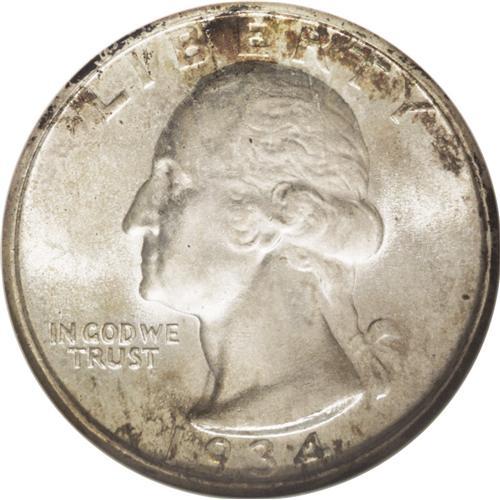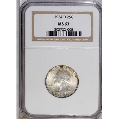 <B>1934-D<25C> Medium Motto MS67 NGC.</B></I> An original and impeccably preserved '34-D Washington that boasts unbeatable luster and is lightly toned in mottled russet shades near the obverse borders, while the reverse is mostly brilliant. Boldly defined throughout. Only six MS67 examples have been certified by both services combined, with none graded any higher (7/06).