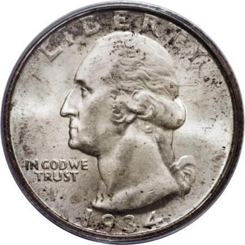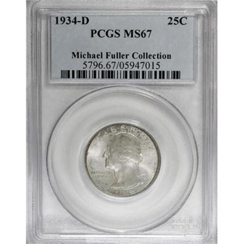 <B>1934-D 25C Medium Motto MS67 PCGS.</B></I> The 1934-D Washington quarters are found only with the Medium Motto and Heavy Motto variants, unlike the Philadelphia Mint issue which is found in Light, Medium, and Heavy Motto types. Blushes of silver-gray patina complement the bold luster present on both sides. The well-struck surfaces are almost entirely free of singular abrasions, save for an undistracting tick on Washington's neck. This MS67 piece is in the top tier of known examples of the Medium Motto variety, as PCGS has certified only four coins in this grade, with none finer (10/07).<BR><I>From The Michael Fuller Collection.</B></I><BR><BR><B>Coin Engraver:</B> John Flanagan<BR><BR><b>Shipping:</b> Coins & Currency (<a target="_blank" href="http://www.heritageauctions.com/common/shipping.php">view shipping information</a>)