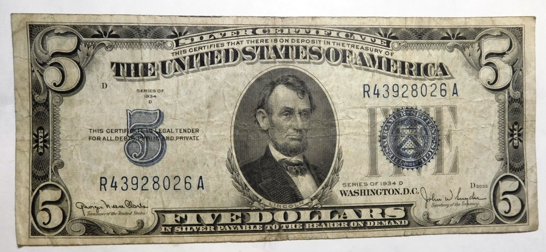 1934-D $5.00 SILVER CERTIFICATE VG