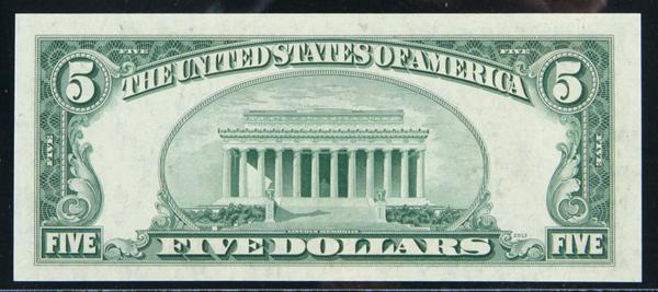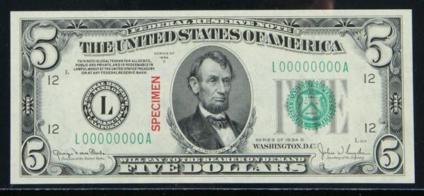 1934-D, $5 Federal Reserve Note. SPECIMEN