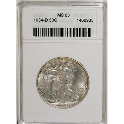 <B>1934-D 50C MS63 ANACS.</B></I> . NGC Census: (172/776). PCGS Population (306/1271). Mintage: 2,361,400. Numismedia Wsl. Price for NGC/PCGS coin in MS63: $220. (#6593)<BR><BR><B>Coin Engraver:</B> Adolph A. Weinman<BR><BR><b>Shipping:</b> Coins & Currency (<a target="_blank" href="http://www.heritageauctions.com/common/shipping.php">view shipping information</a>)