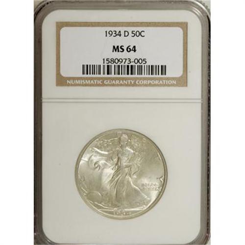 <B>1934-D 50C MS64 NGC.</B></I> NGC Census: (521/238). PCGS Population (688/532). Mintage: 2,361,400. Numismedia Wsl. Price for NGC/PCGS coin in MS64: $324. (#6593)<BR><BR><B>Coin Engraver:</B> Adolph A. Weinman<BR><BR><b>Shipping:</b> Coins & Currency (<a target="_blank" href="http://www.heritageauctions.com/common/shipping.php">view shipping information</a>)