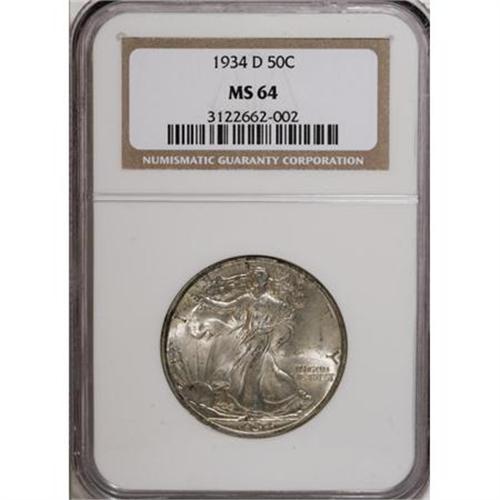 <B>1934-D 50C MS64 NGC.</B></I> . NGC Census: (533/243). PCGS Population (720/551). Mintage: 2,361,400. Numismedia Wsl. Price for NGC/PCGS coin in MS64: $380. (#6593)<BR><BR><B>Coin Engraver:</B> Adolph A. Weinman<BR><BR><b>Shipping:</b> Coins & Currency (<a target="_blank" href="http://www.heritageauctions.com/common/shipping.php">view shipping information</a>)