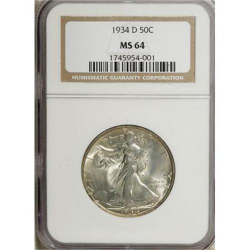 <B>1934-D 50C MS64 NGC.</B></I> NGC Census: (533/243). PCGS Population (725/556). Mintage: 2,361,400. Numismedia Wsl. Price for NGC/PCGS coin in MS64: $380. (#6593)<BR><BR><B>Coin Engraver:</B> Adolph A. Weinman<BR><BR><b>Shipping:</b> Coins & Currency (<a target="_blank" href="http://www.heritageauctions.com/common/shipping.php">view shipping information</a>)
