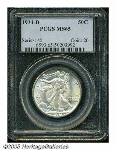 <B>1934-D<50C> MS65 PCGS.</B></I> Faint champagne-gray surfaces display glowing luster. The design features are well struck, with Liberty's left thumb showing partial definition. A couple of minor marks are noted on Liberty's head and neck, and a small milling mark is concealed within the eagle's neck feathers.